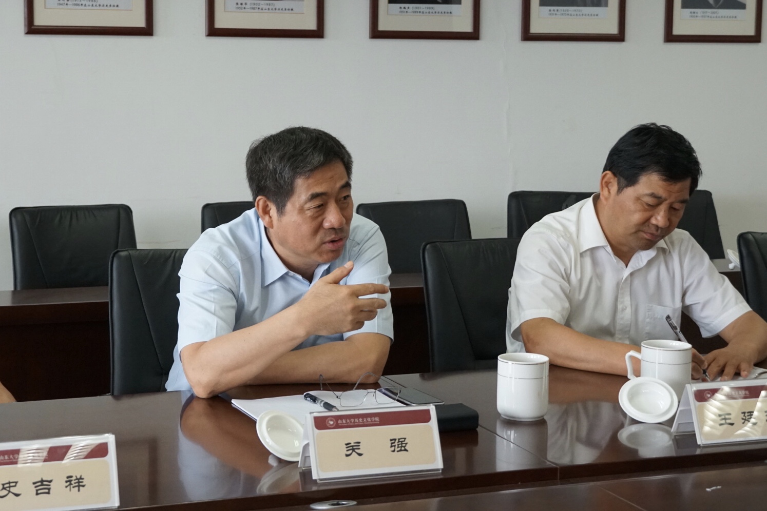 参观展览后,关强到历史文化学院就高校考古文博人才培养及高校博物馆发展进行调研座谈。历史文化学院、文化遗产研究院院长、太阳成tyc122cc集团博物馆馆长方辉,历史文化学院党委书记刘军、副院长王芬,博物馆副馆长李慧竹等参加座谈。