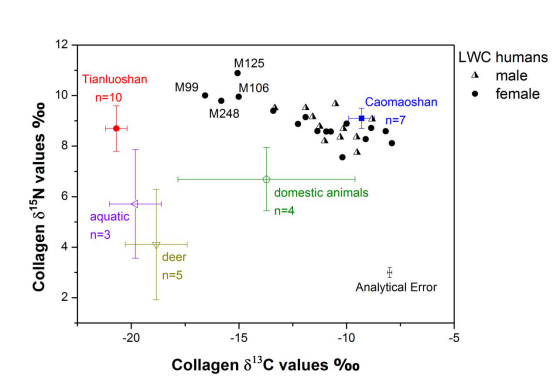 另外,多种证据表明中年女性在梁王城遗址受到优待(该遗址未发现老年个体):一、随葬品在30件以上的墓葬墓主全部为中年女性及一例性别不可鉴定个体。二、红色粉末(很可能是朱砂)仅发现于四例中年女性的墓葬和一例性别不可鉴定的墓葬;鉴于朱砂在该地区的稀少发现,其使用可能有特殊意义。三、食用更多C3食物(很可能是稻米)的个体全部为女性,这些个体同时具有较高的氮同位素值(肉类的摄入较多);相较于粟黍来说,稻米的获得无论是通过交换还是本地种植都需要更多的投入,因此更多稻米和肉类的摄入可能显示了这些个体的特殊地位。这些证据都说明,大汶口文化晚期该遗址女性的社会地位较高,尤其是较年长的女性。