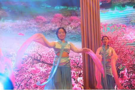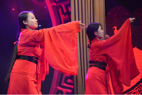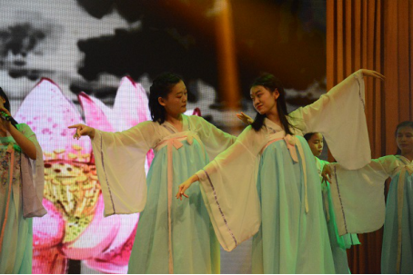 胡熙、张怡然等六名女生身着大袖罗衫,带来《礼仪之邦》。一曲舞蹈之中蕴含了中华五千年的礼仪之美,悠悠余韵,古意盎然。