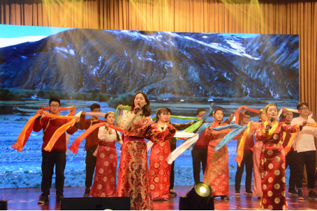 永金卓玛、次仁桑吉等藏族同胞和汉族同学们身着藏族特色服饰,共同演绎了一曲《幸福拉萨》,歌声仿佛带我们到了巍巍高原之上,蓝天白云,艳阳高照,尽显民族特色。