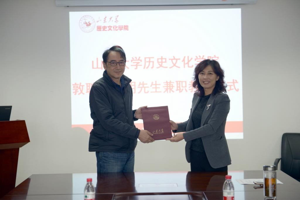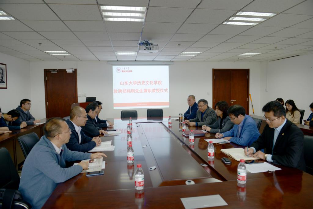 10月25日上午,历史文化学院在知新楼举行仪式,敦聘香港大学饶宗颐学术馆副馆长、高级研究员郑炜明先生为学院兼职教授。学院党委书记刘军、学术委员会主任陈尚胜、党委副书记朱继磊、副处级组织员薛辰兵以及韩吉绍、王建锋、胡孝忠等教师和部分博士、硕士研究生代表参加了聘任仪式。副院长刘家峰主持仪式。