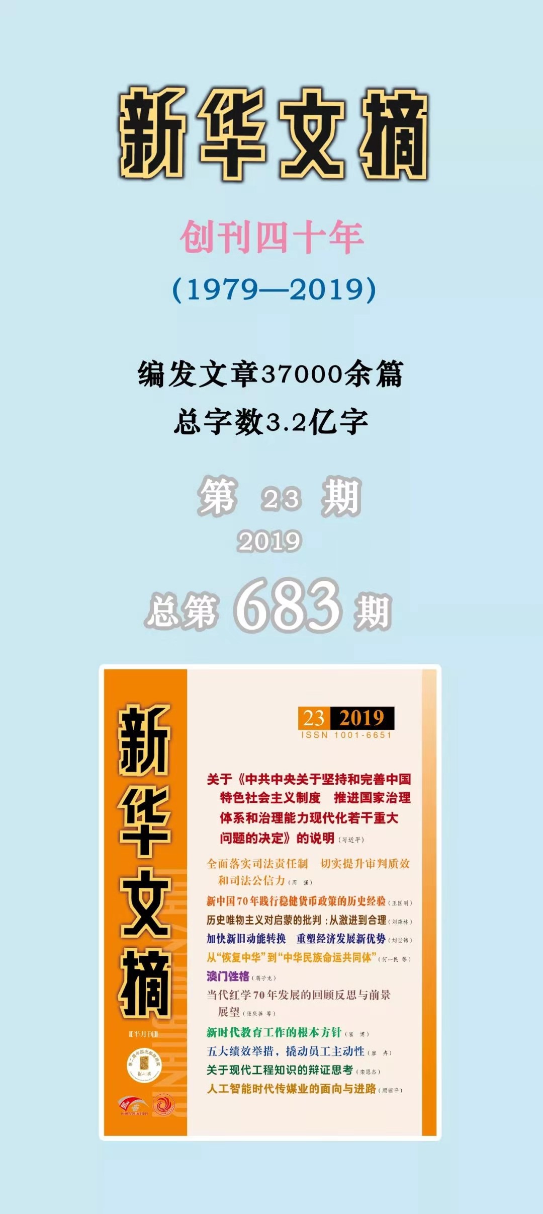 《新华文摘》是由国家新闻出版广电总局主管、人民出版社主办、新华文摘杂志社编辑出版的大型理论性、综合性、资料性文摘类期刊,主要反映政治、经济、文化、社会、科技等方面的最新进展,以思想性、学术性、权威性和可读性享誉海内外,是中国最具影响的哲学社会科学文摘类杂志。