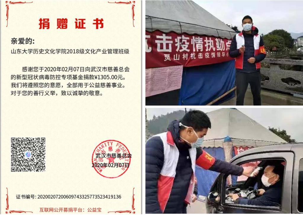 青年的志愿担当越是危难时刻越能彰显,我院青年学子在这场疫情防控阻击战中主动担当作为,积极为疫情防控奉献青春力量。2019级本科生王逸鸿同学深受母亲作为医务工作者的积极影响,投身基层防疫志愿服务中,在浙江省杭州市双浦镇灵山村担任疫情防控志愿者;2017级本科生李冰倩同学积极参与村委会开展的疫情防控志愿活动,向村民普及疫情防控知识并及时劝阻村民外出和人员流动,帮助广大村民提升防护意识;2016级本科生王新宇同学协助所在社区工作人员宣传防疫知识,积极参与排查、劝导工作并及为居家群众提供服务保障。与此同时,2018级文化产业管理专业全体学生共同发起为疫区捐款活动,用自己的一份力量支持疫区前线的疫情抗击工作。病毒无情、青年有爱,在肆虐的疫情面前,我院青年学生用实际行动主动作为、奉献爱心,充分展现了山大青年学子的家国情怀和担当精神。