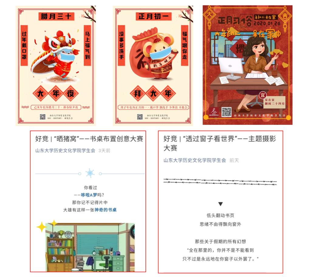 我院学生会、研究生会积极响应“不外出、不聚集”的号召,充分利用网络平台组织了丰富多彩的互动交流活动。通过广泛征求同学需求,推出“好竞”“好玩”“历历在目”等线上专题,涵盖学习资源分享、生活技能学习等方面,为同学们提供了学习交流、互动共享平台。学院同学发挥专业优势与自身专长积极参与其中,古今中外、天文地理、经济人文,一篇篇精彩书评激荡思想;糖醋鲤鱼、三汁焖锅、红烧排骨,一道道美味佳肴跃然“线上”;图书分类、代码编写、写作绘画,一项项生活技能隔空传递。各班级同学主动组织“线上自习室”,通过视频连线、每日打卡等形式互相督促知识学习、交流学习体会。学生会、研究生会微信公众平台根据春节习俗和应对疫情新形势,推出系列特色海报与手机壁纸,在传播中华优秀传统文化的同时,积极宣传普及疫情防控知识。