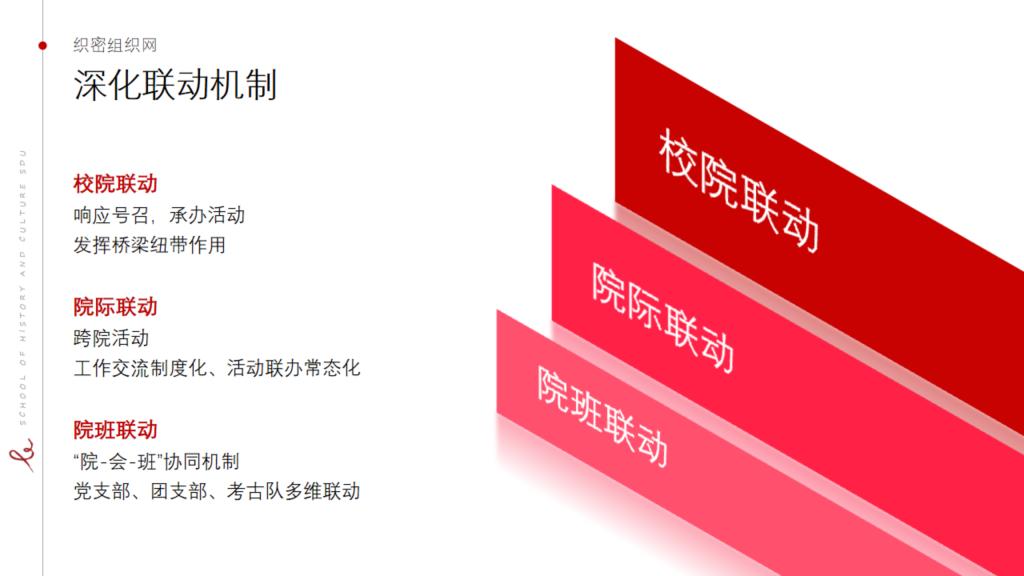 在组织建设方面,院学生会和研究生会落实精简组织、优化职能的原则,不断提升工作效率。学生会以一纵三横为抓手推动学生会组织改革和多维联动深入,制定学生会内部体制建设的《管理章程》,实现有章可循、依章办事,调整架构、精简人员;从校院联动、院际联动、班际联动等三个方面构筑联动机制,发挥桥梁纽带作用,推动工作交流制度化、活动联办常态化,探索学生组织与党、团支部的联动实践。研究生会进一步巩固和完善团学组织格局,明晰职能定位和工作范围;坚持和完善中期述职与学年测评相结合的考核制度,部门、班团联席制度等制度体系,定期召开会议,充分发挥研究生会在学生组织中的主体作用。