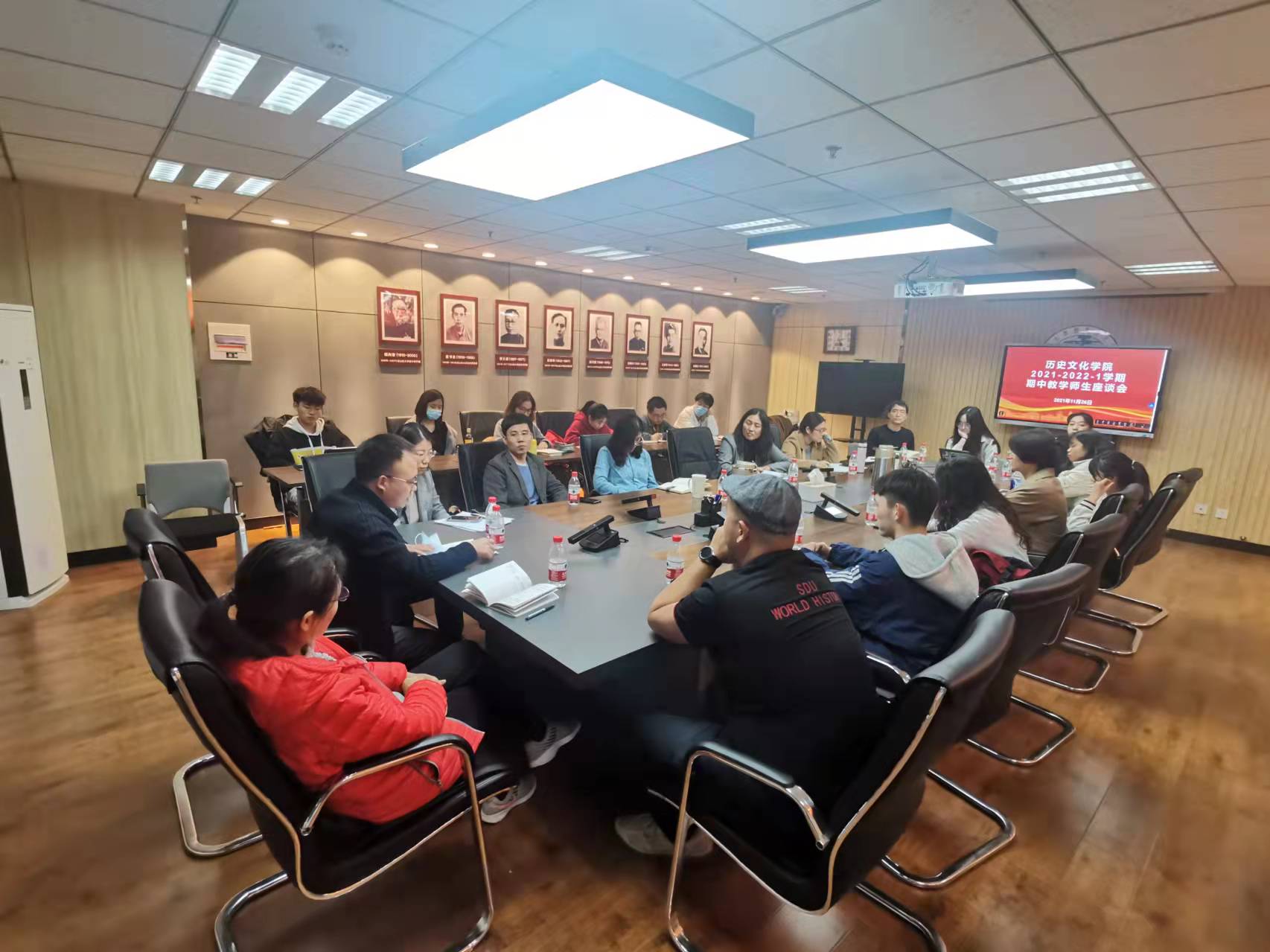 为了全面了解本学期教学运行状况,进一步加强日常教学管理,及时发现和解决教学过程中存在的问题,11月26日下午,历史文化学院召开期中教学检查师生座谈会。副处级辅导员李一楠、院长助理曲春梅、各学系系主任、各年级辅导员、本科教学秘书、教师代表以及学生代表共40余人参加座谈。