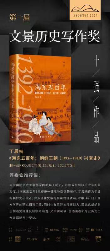 我院丁晨楠副研究员著作《海东五百年:朝鲜王朝(1392-1910)兴衰史》(漓江出版社)入围第一届“文景历史写作奖”十强。本书兼顾了学术性与公共性,以流畅细腻的文笔讲述了纷繁复杂的朝鲜王朝史。该奖项由著名人文社科出版品牌“上海世纪出版集团·世纪文景”主办,每两年评选一届,秉持公平、公正、专业的原则,旨在发掘和鼓励优秀的历史写作者,不断拓展视野、跨越边界,使那些直面重要问题的历史书写进入更为广阔的公众视野。本届评选邀请到了刘北成、罗新、王笛、许宏、杨念群5位历史学领域的知名学者担任决选评委。同时,还邀请了10位不参加本届奖项评选的青年历史学者、资深书评人、媒体人担任初选评委。初选的评阅关注作品的思想性、系统性、公共性,尤其强调作品在写作方面的完成度和阅读体验。