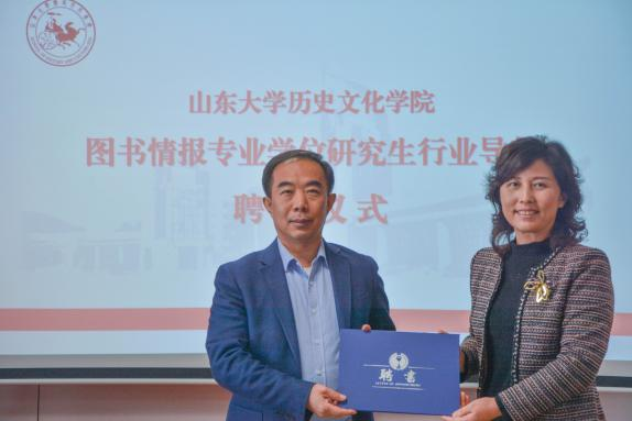 12月14日下午,山东省图书馆党委书记、馆长刘显世太阳成tyc122cc集团图书情报专业学位研究生行业导师聘任仪式暨学术报告会在中心校区知新楼A座1017报告厅举行。历史文化学院党委书记刘军向刘显世颁发聘书。聘任仪式由文秘档案学系主任曲春梅主持,部分图情专硕导师、文秘档案学系师生参加了此次活动。