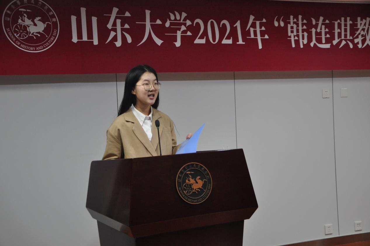韩榛在发言中首先对所有获奖学生表示了祝贺。同时,进一步带大家回顾了韩连琪教授生平事迹,传达了韩连琪教授作为老一辈研究者对历史学科建设的支持与对青年学子的希冀。希望未来进一步同学校、学院做好韩连琪教授基金委员会工作,支持帮助更多青年学生投入到史学研究中。
