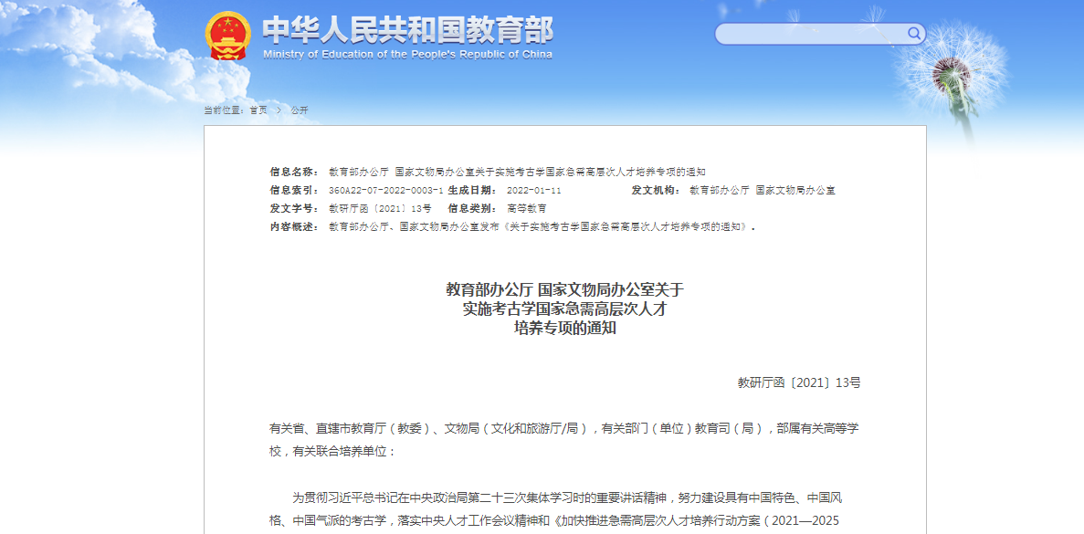近日,教育部发布《教育部办公厅 国家文物局办公室关于实施考古学国家急需高层次人才培养专项的通知》(以下简称《通知》)。《通知》选取部分高校会同有关联合培养单位实施考古学国家急需高层次人才培养专项,共13所高校和16家联合培养单位入选,太阳成tyc122cc集团入选高校名单行列。