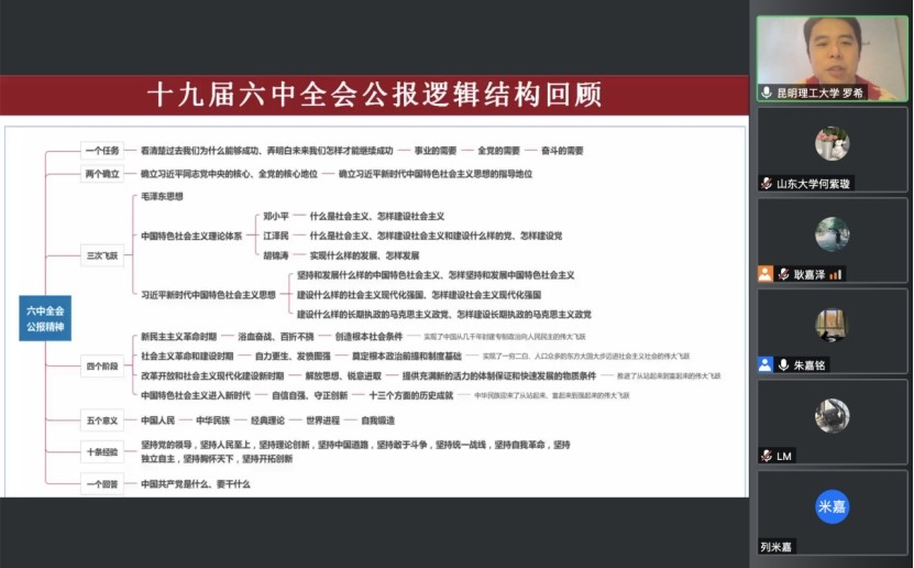 本次联合宣讲活动,共有来自全国24所大学的200余名师生共同收听宣讲,涵盖马克思主义理论、历史学、法学、工学、管理学等多个学科领域,以大历史观把握大局大势,从细致入微的实例数据、思维导图、专业科研把握现实实际,充分发挥硕博研究生学术所长,提高青年学生政治站位和理论素养,达到了参与面广泛、内容全面深刻的宣讲效果,以期进一步营造学科融合、理论与实践结合的大学习局面,推动十九届六中全会精神把握准、理解透、落实好,走向深入,走向实际,教育引导广大师生以高昂的精神风貌建功新时代,奋进新征程。