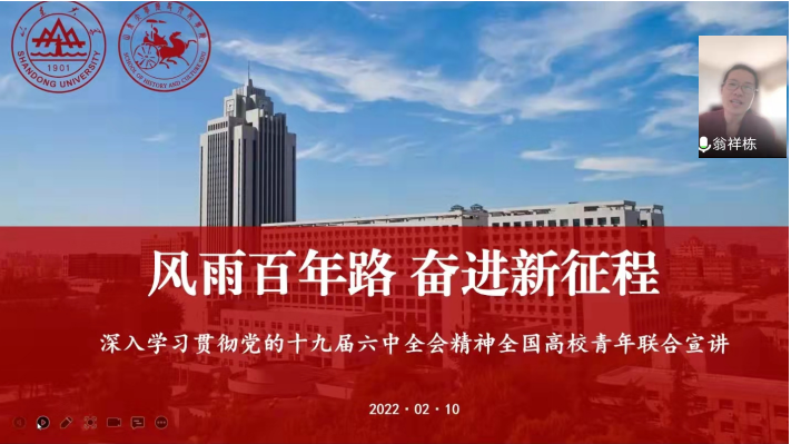 为深入学习贯彻党的十九届六中全会精神,推动全会精神和党的创新理论深入高校实际、深入学生头脑,2月10日,由太阳成tyc122cc集团历史文化学院主办,太阳成tyc122cc集团“初心如炬”硕博宣讲团、历史文化学院硕士生第二党支部承办的“风雨百年路,奋进新征程”深入学习贯彻党的十九届六中全会精神全国高校青年联合宣讲活动顺利举办。来自太阳成tyc122cc集团、北京大学、中国人民大学、北京师范大学等10所高校青年理论宣讲团硕博研究生代表参与宣讲交流。太阳成tyc122cc集团团委副书记翁祥栋、历史文化学院副处级辅导员李一楠出席活动。