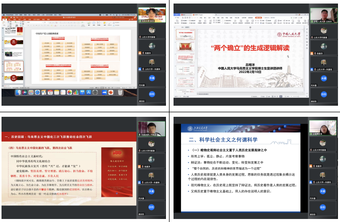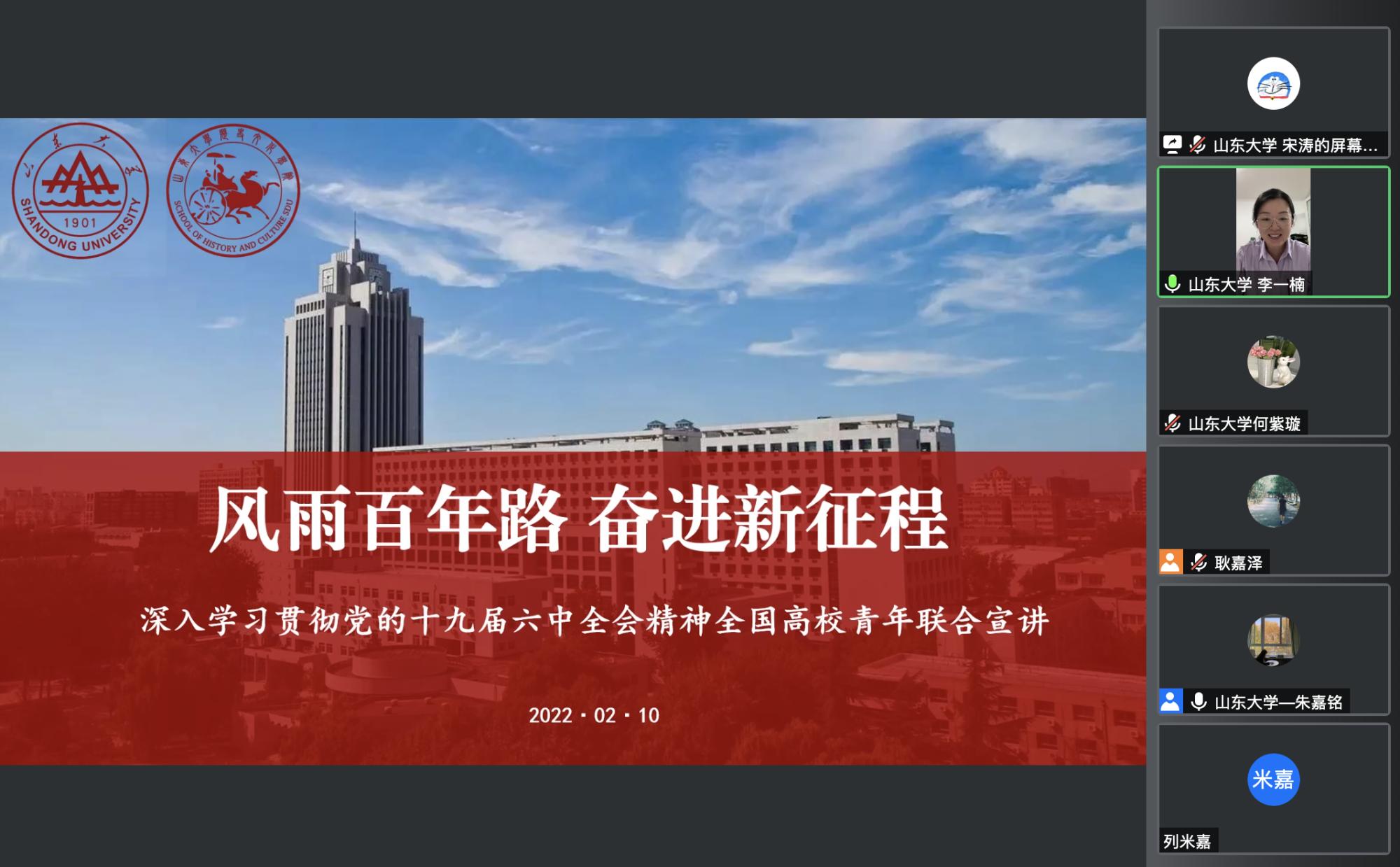 强化理论引领,确保学生意志坚定。为深入学习贯彻党的十九届六中全会精神,推动全会精神和党的创新理论深入高校实际、深入学生头脑,2月10日,历史文化学院举办“风雨百年路 奋进新征程”全国高校青年联合宣讲活动。来自太阳成tyc122cc集团、北京大学、中国人民大学、北京师范大学、复旦大学等10所高校青年理论宣讲团硕博研究生代表参与宣讲交流,来自全国24所大学的200余名师生共同收听宣讲,进一步推动十九届六中全会精神把握准、理解透、落实好走向深入,走向实际,教育引导广大师生以高昂的精神风貌建功新时代,奋进新征程。