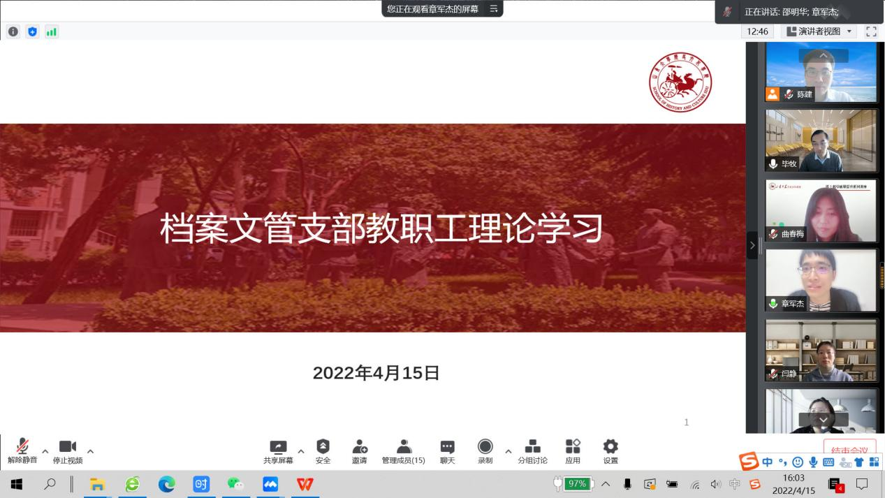 4月15日,历史文化学院党委9个教工党支部分别召开全体教职工会议,围绕《凝聚起坚不可摧的强大力量——习近平总书记关于打赢疫情防控的人民战争总体战阻击战重要论述综述》《高等学校新冠肺炎疫情防控技术方案(第五版)》等内容开展集体学习研讨,强调贯彻“外防输入、内防反弹”总策略和“动态清零”总方针不动摇,严格要求全体教工坚决克服在防疫过程中出现的松懈麻痹思想,做到在疫情防控工作中知责明责、履责尽责。中国近现代史教研室全体教职工就如何做好防疫教研工作的同步协调和共同推进发表意见,深刻认识到加强统一领导在疫情防控中的重要性和必要性。古代史教研室全体教职工表示,一定会遵循文件要求,做好自身防护,遵守属地防疫政策,严格落实核酸检测等要求,对学生多关心指导,着力推进教育教学等各项工作。