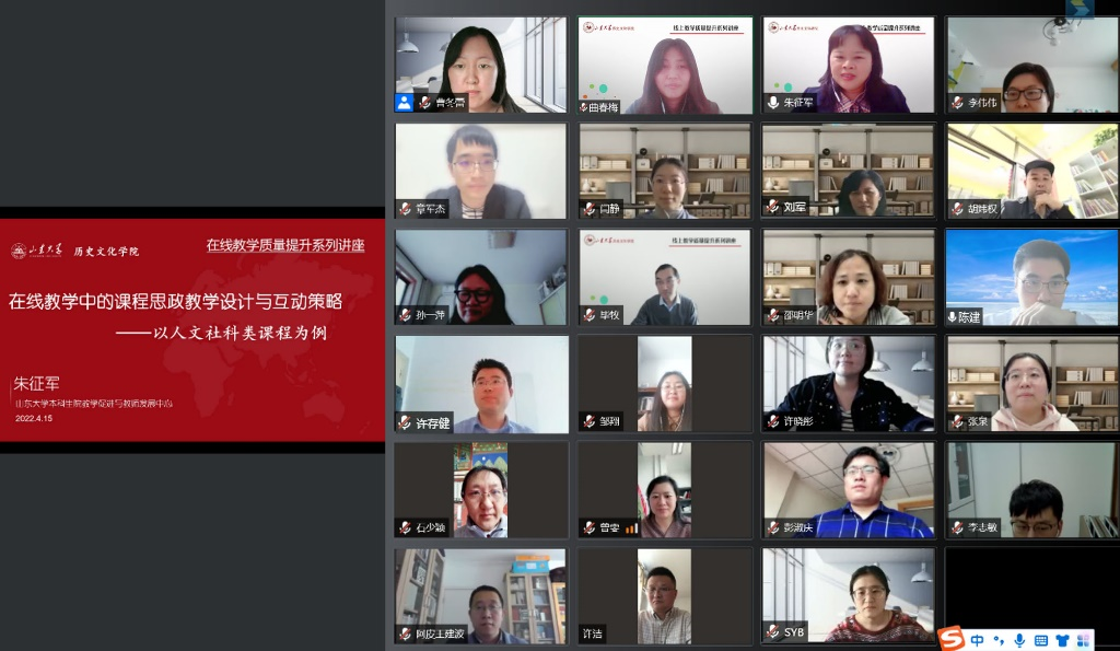 转入线上教学模式以来,历史文化学院高度重视线上教学工作的有序开展,迅速成立由学院主要负责人任组长的线上教学工作组,对全院课程展开督导听课,及时发现线上授课过程中存在的问题和需要解决的困难,全力保障线上教学质量和水平。此次培训是学院线上教学能力提升系列培训活动之一,为有效提升教师线上授课技巧、将课程思政有机融入教学目标提供了理念、经验与方法上的指导,也为学院更好地开展线上教学、提升教学质量和效果提供了有力支持。