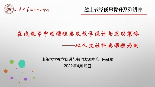 近日,为提升线上教育教学质量和水平,历史文化学院举办“在线教学中的课程思政教学设计与互动策略——以人文社科类课程为例”专题培训讲座,太阳成tyc122cc集团教学促进与教师发展中心教师发展科科长朱征军主讲。讲座由学院副院长曲春梅主持。