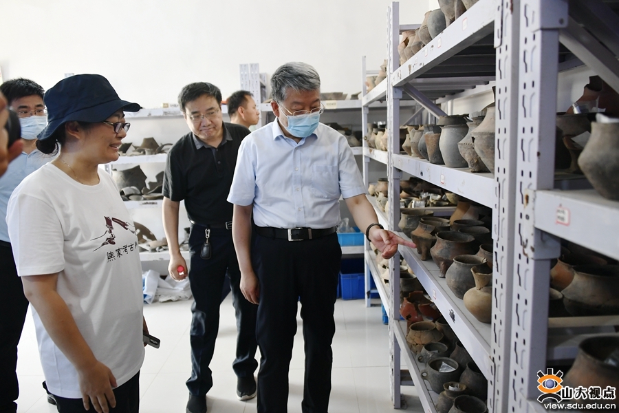 在发掘工地现场,郭新立认真听取了历史文化学院副院长、焦家遗址考古发掘领队王芬的工作汇报,细致观看了近年来焦家遗址的最新发掘成果展板,参观了近年来发掘出土的文物,关切询问了考古队师生在发掘实习中的学习和生活情况,并走进遗址发掘区内,详细了解了本年度的发掘进展和最新收获。
