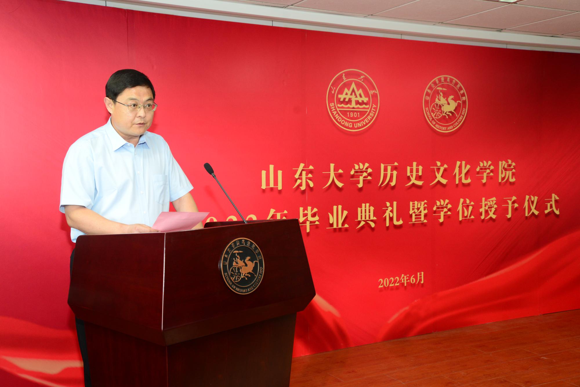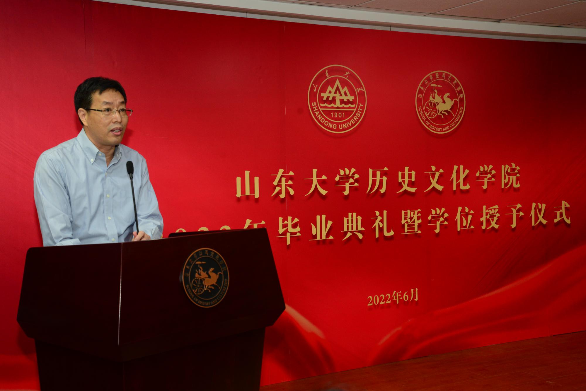 教师代表刘家峰表达了对同学们学有所成、顺利毕业的祝贺。发言中,他回顾了自身的求学经历和学术历程,讲述了山大历史学科的变迁和发展。他提到,希望所有毕业生重视反思的价值,保持谦逊的态度,保有坚韧、坚持、专注的精神,要肯定在大学学习阶段所取得的进步,永葆山大人的精神品格。发言语重心长、情真意切,他期待毕业生们未来都能做热心帮助他人,做能独立思考、平等待人而又谦卑的人,用自己的生命去影响更多的生命,在奋斗中成就精彩人生。