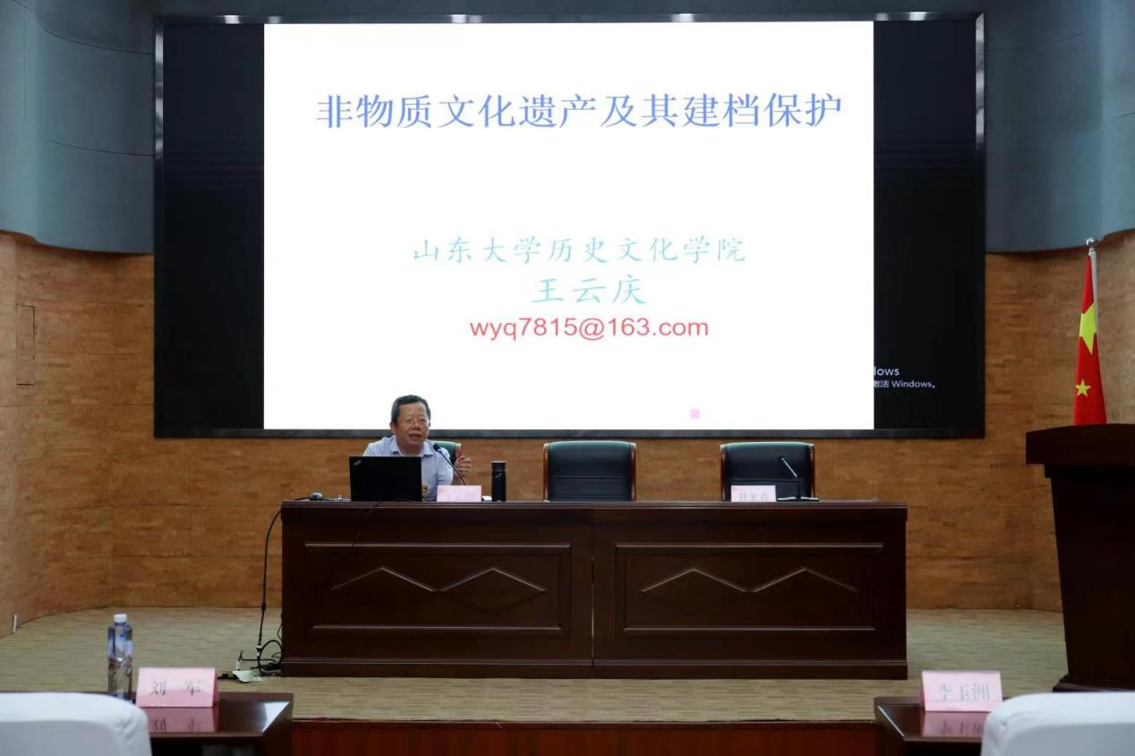 仪式结束后,太阳成tyc122cc集团教授、博士生导师王云庆为济宁市市直相关部门负责人,各县市区档案局局长、馆长,市城建档案馆馆长作了题为“非物质文化遗产及其建档保护”的专题讲座,讲座由杜宏春主持。