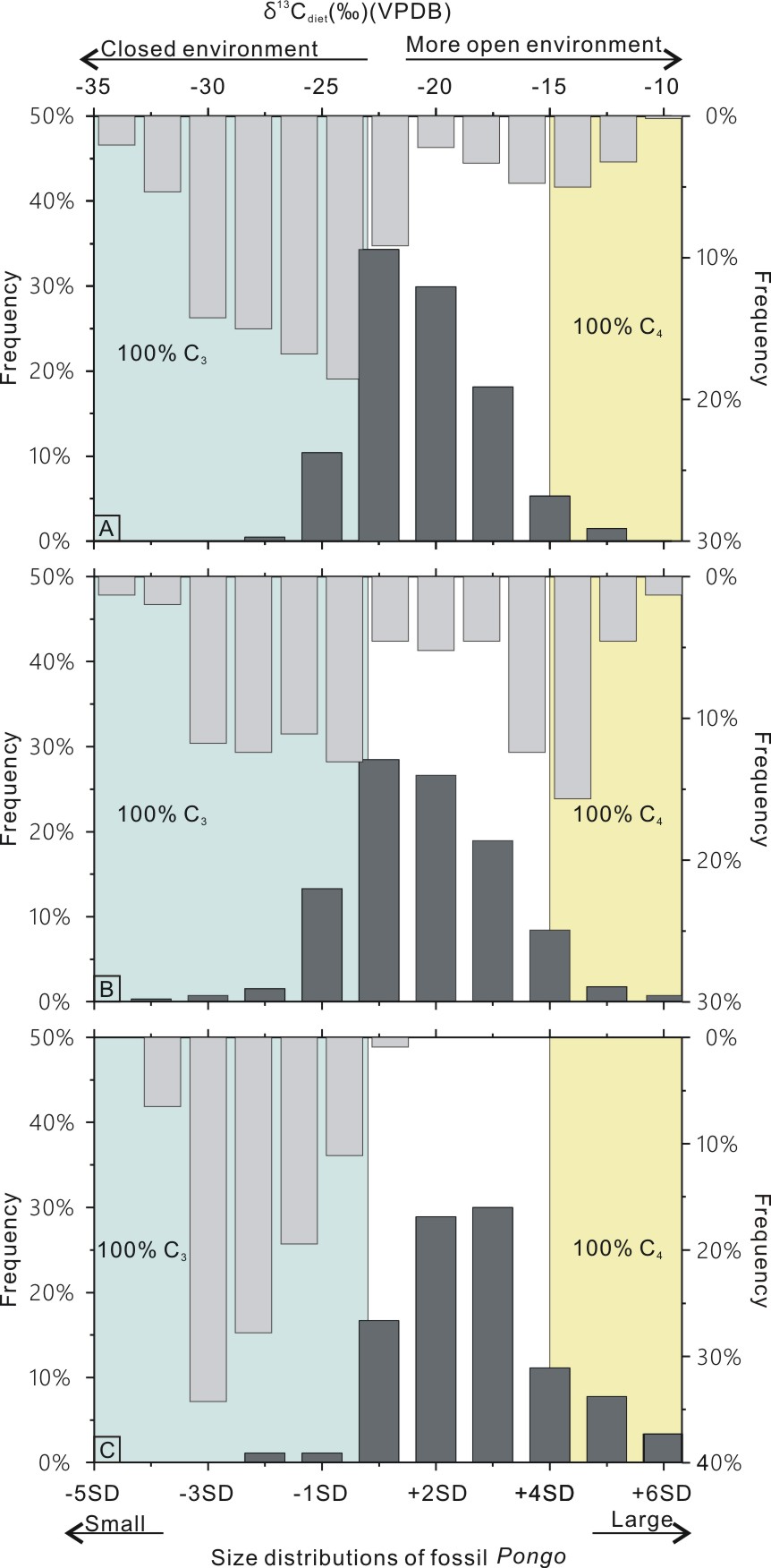 图4、东南亚大陆猩猩牙齿大小分布和碳同位素数据比较