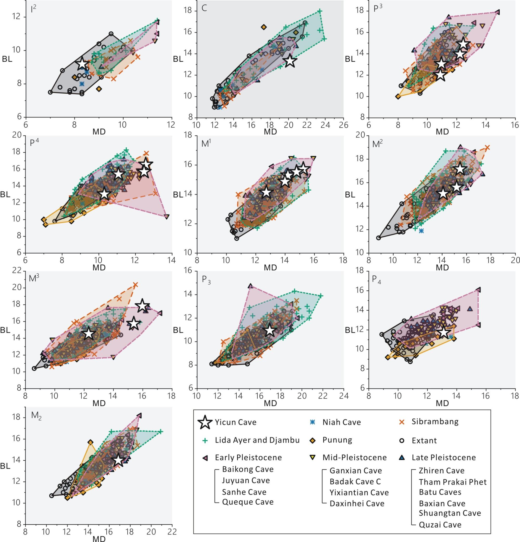 图3、宜村洞遗址猩猩牙齿化石的尺寸比较