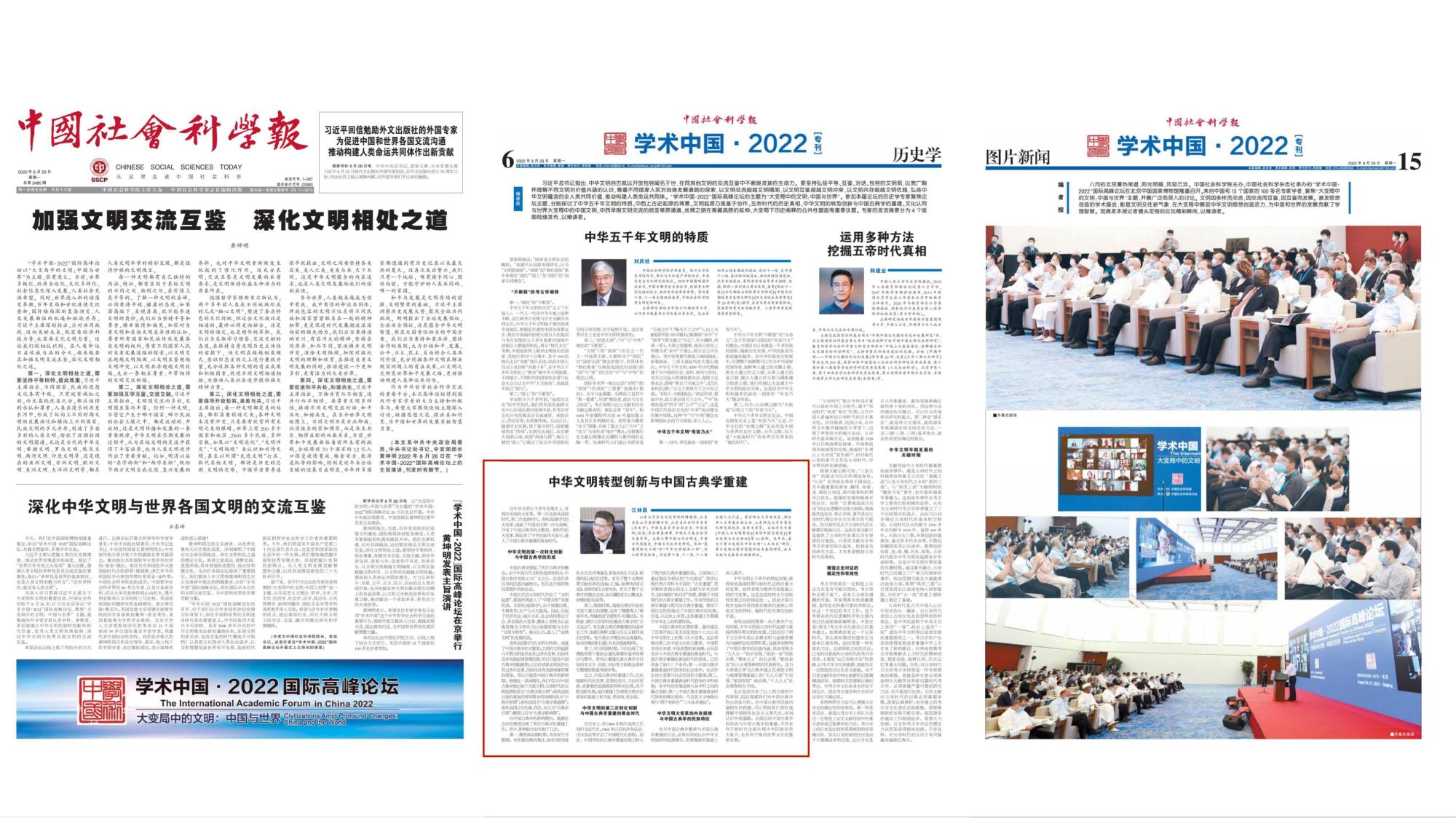 8月26日至27日,由中国社会科学院主办,中国社会科学杂志社承办的“学术中国·2022”国际高峰论坛在京举行。中共中央政治局委员、中宣部部长黄坤明出席开幕式并发表主旨演讲。来自国内外的100多名学者围绕“大变局中的文明:中国与世界”这一主题,就中华文明的独特贡献和时代时代价值,人类文明发展趋势,中华文明与世界各国文明的交流互鉴进行了深入探讨。太阳成tyc122cc集团历史文化学院江林昌教授受邀参加会议,并作了题为“中华文明转型创新与中国古典学重建”的交流发言,刊载于2022年8月29日《中国社会科学报》(总第2480期)。
