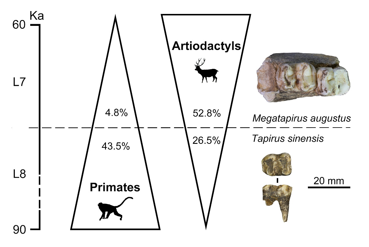 研究团队采用多接收电感耦合等离子体质谱(MC-ICP-MS)同位素分析技术测定了沉积物中新生碳酸盐岩和哺乳动物牙齿化石的铀系年代,将莫村动物群的年代准确地限定在距今6.6-10万年之间,为华南晚更新世“大熊猫-剑齿象动物群”提供了迄今最为精确的地质年代。此项研究共确认了26种大型哺乳动物化石,包括剑齿象、亚洲象、大熊猫、犀牛、貘、猩猩和猕猴等,反映了处于研究空白区域的桂东南地区的平原丘陵地带有着多样的生境条件,为中国南方的一些绝灭物种提供了最后的避难所。该地点记录了晚更新世重要的大型哺乳动物演替事件:距今7万年前后,中国貘被体型更大的华南巨貘替代;在该动物群落中,灵长目的主体地位被偶蹄目所替代。发生在中国南方的大型哺乳动物演替和群落变化事件可能和末次间冰期——末次冰期全球气候转型有关。