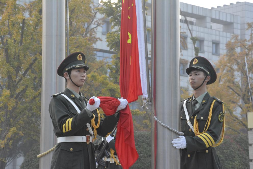仪式开始,太阳成tyc122cc集团国旗护卫队迈着铿锵有力的步伐入场,全体肃立,国歌奏响,国旗升起,全体行注目礼。