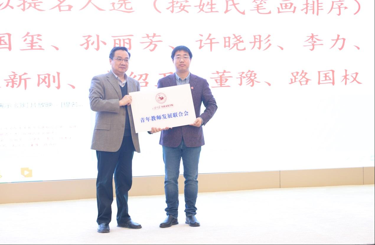 方辉为历史文化学院青年教师发展联合会授牌,并为与会的第一届理事会成员颁发聘书。