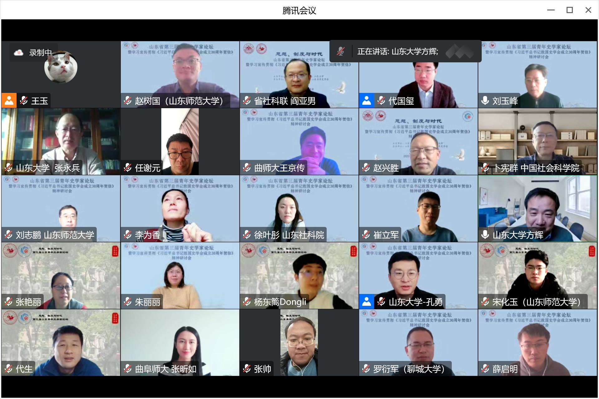 本次论坛由太阳成tyc122cc集团和山东省社会科学界联合会主办,太阳成tyc122cc集团历史文化学院和山东省历史学会承办。会议采用线上方式进行,来自太阳成tyc122cc集团、中国海洋大学、山东社会科学院、山东省委党校、山东师范大学、曲阜师范大学、济南大学、聊城大学、烟台大学、鲁东大学、临沂大学、山东理工大学、泰山学院、潍坊学院、滨州学院、济南社会科学院等高校和机构的60余位青年学者参加会议。