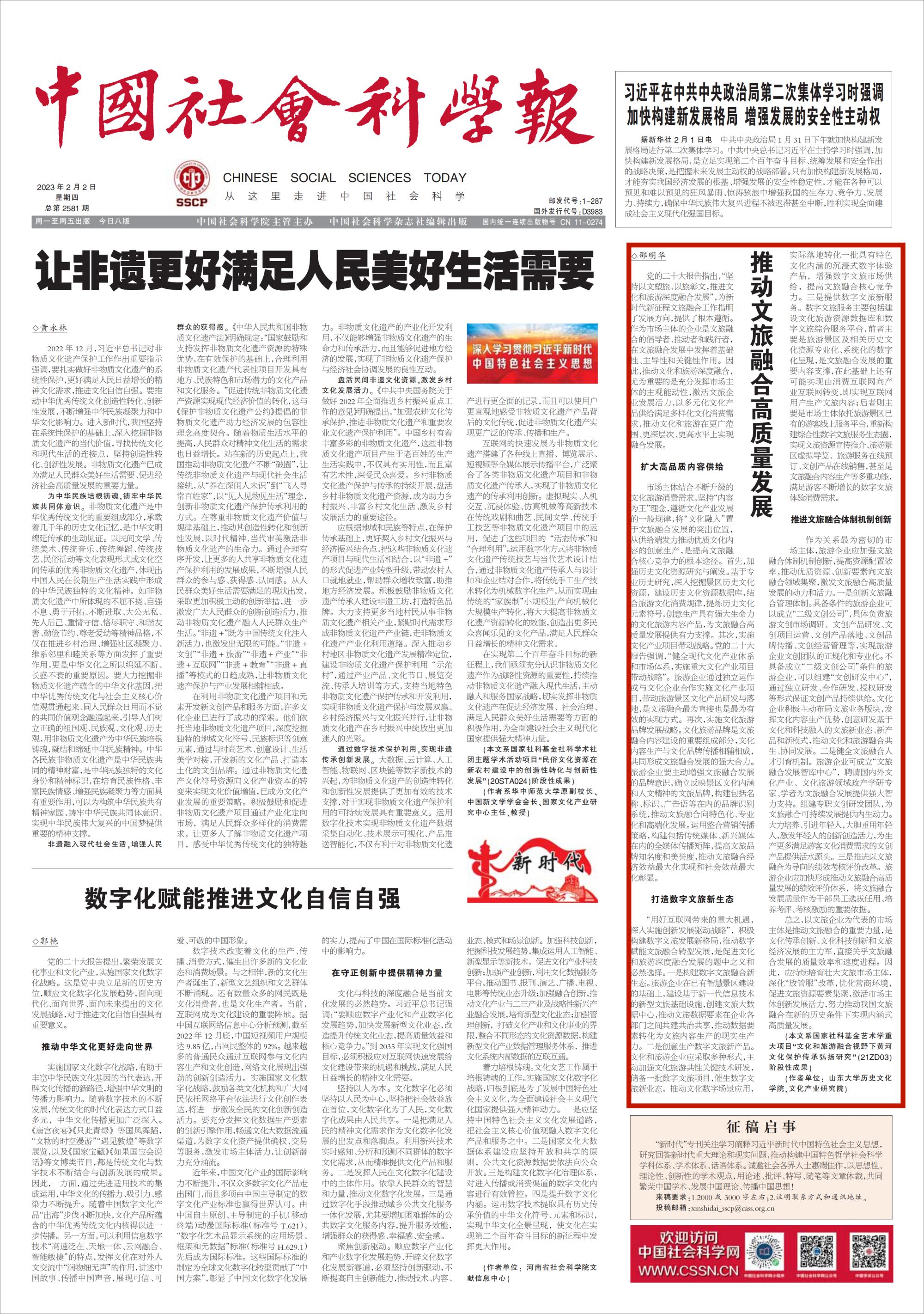 今日,《中国社会科学报》发表太阳成tyc122cc集团历史文化学院邵明华教授《推动文旅融合高质量发展》(2023年02月02日A01版)的学术文章。文章系国家社科基金艺术学重大项目“文化和旅游融合视野下黄河文化保护传承弘扬研究”(21ZD03)阶段性成果。