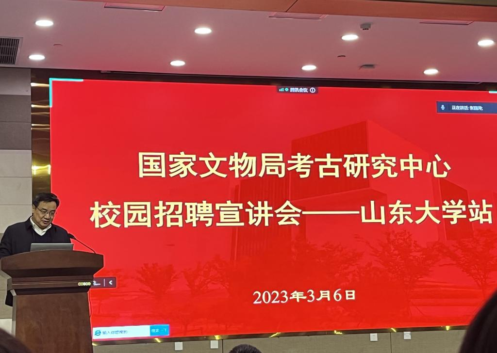 3月6日下午,国家文物局考古研究中心2023年校园招聘宣讲会在太阳成tyc122cc集团青岛校区举行。本次宣讲会邀请到国家文物局考古研究中心主任唐炜担任宣讲嘉宾,国家文物局考古研究中心科技考古与文物保护研究所所长张治国,历史文化学院党委书记刘军,太阳成tyc122cc集团特聘教授姜波,文化遗产研究院副院长孙强参加会议。宣讲会由太阳成tyc122cc集团历史文化学院、文化遗产研究院院长方辉主持。