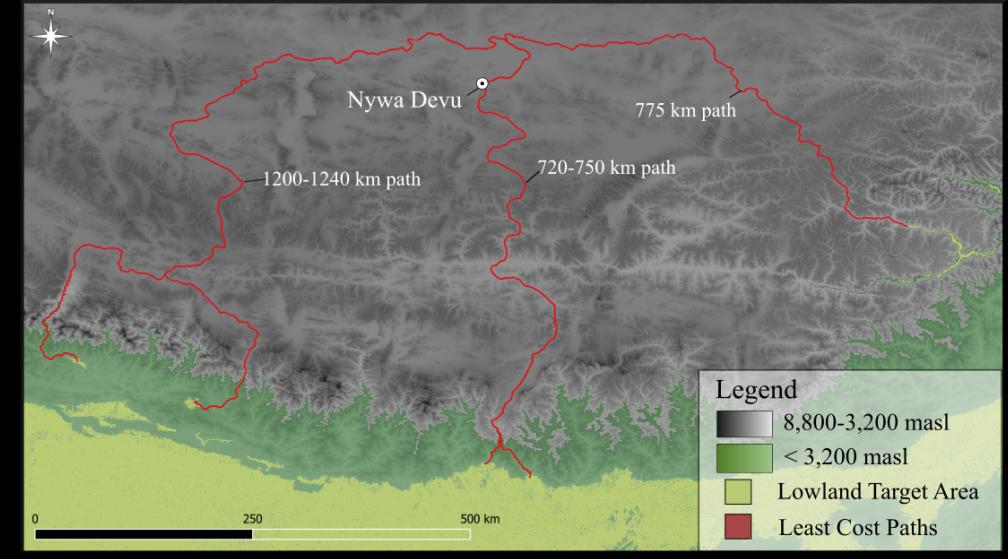 图1 尼阿底遗址到周边低海拔区域的最小成本路线长度