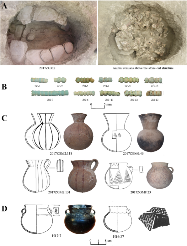 图3 格布赛鲁遗址早期墓葬(A)出土的釉砂珠(B)和圜底陶器(C)和曲贡遗址的典型圜底器(D)