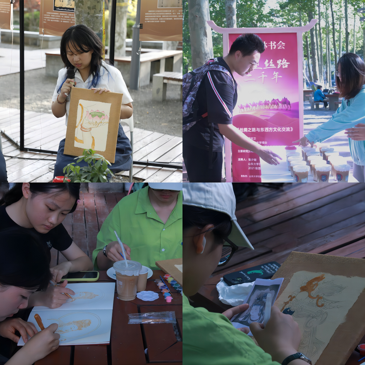 此次活动设置了敦煌壁画线描和泥板壁画临摹活动区,吸引了众多同学参与体验,他们用心描绘着一笔一线,力求还原古代壁画的神韵,相关同学也上台进行了作品展示和心得分享。