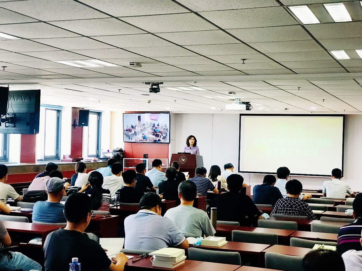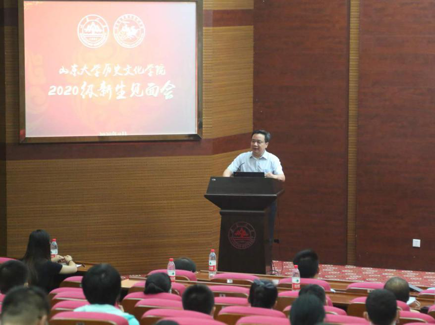 历史文化学院2020级研究生新生见面会在知新楼思源报告厅举行。历史文化学院院长方辉、党委书记刘军、副院长王芬、副院长代国玺、党委副书记张伟,挂职副院长张琦、张晓冉,文秘与档案学系主任曲春梅、考古与博物馆学系主任唐仲明出席见面会,2020级研究生辅导员曹明明与全体研究生新生参会。会议由副处级辅导员李一楠主持。