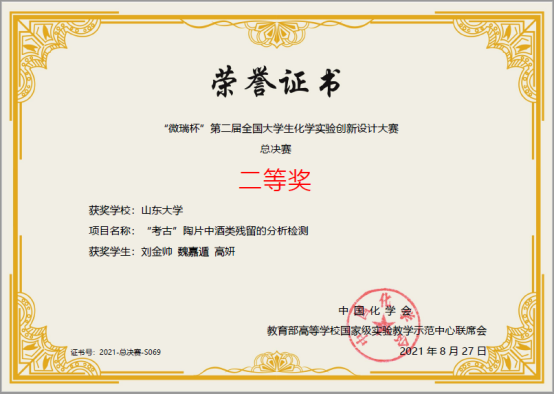 第二届全国大学生化学实验创新设计竞赛总决赛在青岛科技大学举行。历史文化学院2019级本科生高妍、化学与化工学院本科生刘金帅、魏嘉遁共同完成的创新设计项目《“考古”陶片中酒类残留的分析检测》获得全国大学生化学实验创新设计竞赛二等奖。