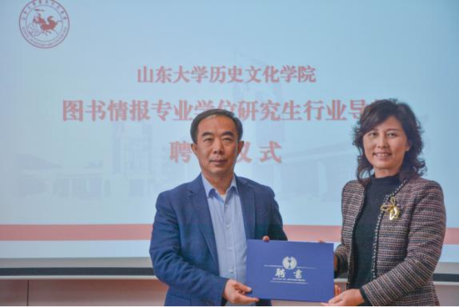 山东省图书馆党委书记、馆长刘显世太阳成tyc122cc集团图书情报专业学位研究生行业导师聘任仪式暨学术报告会在中心校区知新楼A座1017报告厅举行。历史文化学院党委书记刘军向刘显世颁发聘书。聘任仪式由文秘档案学系主任曲春梅主持,部分图情专硕导师、文秘档案学系师生参加了此次活动。