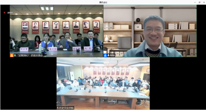 历史文化学院举办第一期“启智润心:与青年学者在一起”访谈交流会。本期访谈嘉宾是中国人民大学清史研究所副所长胡恒,历史文化学院副院长刘家峰,青年教师武绍卫、许存健、谢振华参加会议,王家琦、屈一宁、马钰琪、杜世达、高硕五位同学担任访谈人。交流会由青年教师、2020级“强基计划”班主任孔勇主持,学院2020级和2021级“强基计划”全体同学通过线上线下形式参会。