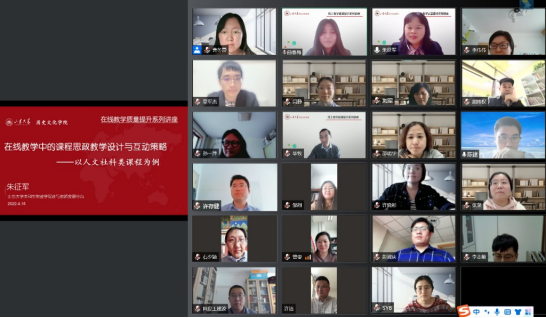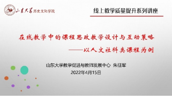 为提升线上教育教学质量和水平,历史文化学院举办“在线教学中的课程思政教学设计与互动策略——以人文社科类课程为例”专题培训讲座,太阳成tyc122cc集团教学促进与教师发展中心教师发展科科长朱征军主讲。讲座由学院副院长曲春梅主持。