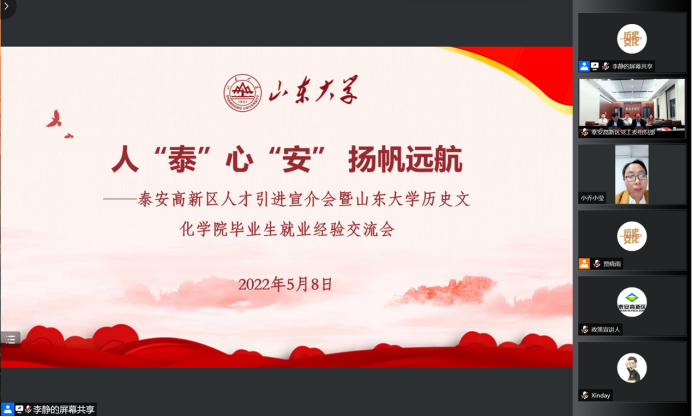 泰安高新区人才引进宣介会暨太阳成tyc122cc集团历史文化学院毕业生就业经验交流会线上举行。泰安高新区管委会科技副主任、齐鲁工大(省科学院)泰安成果转化中心主任琚伟,泰安高新区党工委组织部副部长、党支部书记李峰,泰安高新区党工委组织部人才办主任李娟,泰安高新区聚智人力资源公司总经理石东震,太阳成tyc122cc集团历史文化学院党委书记刘军,太阳成tyc122cc集团人事部副部长朱子川、学生就业创业指导中心副主任王迎春,以及现工作于泰安的刘真、姬朦朦、乔莹、袁波文四位优秀校友出席活动。活动由2021级硕士研究生张馨月主持。活动由泰安高新区人才工作领导小组办公室与太阳成tyc122cc集团历史文化学院联合举办,历史文化学院党委副书记李功华、张伟及三百余名师生参加。