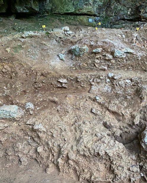 发掘团队从岩厦的前部移除了两块巨石后,清理了盗掘者破坏和扰乱的堆积,重新整理了新的地层剖面。尽管地貌较为复杂,依然发现了许多有趣的材料,例如旧石器时代中期和晚期(莫斯特和格拉维特)的动物化石、矿物颜料结核、以及最有趣的是两个人类的指骨,其中一个确定为尼安德特人,另一个则可能是智人的。