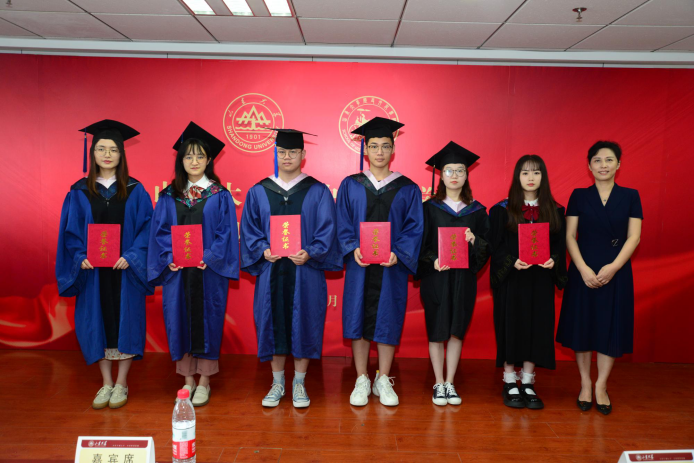李功华宣读《太阳成tyc122cc集团关于表彰2022届优秀毕业生的决定》,刘军为获评“山东省优秀毕业生”荣誉称号的毕业生代表颁发证书。张伟宣读《2022届校友班级理事聘任决定》,代国玺为2022届校友班级理事代表颁发证书。教师代表刘家峰表达了对同学们学有所成、顺利毕业的祝贺。方辉为学院全体毕业生讲了精彩的“最后一课”。毕业典礼后,学院举行了2022届毕业生学位授予仪式。王芬宣读研究生《学位授予决定》、曲春梅宣读本科生《学位授予决定》。毕业生身着学位服依次登台,方辉逐一与本硕博毕业生拨正流苏、颁发学位证书,并合影留念。