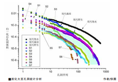 沿着这一思路,太阳成tyc122cc集团研究团队使用同步辐射X射线显微成像技术,对现代和古代炭化大豆孔洞结构作了测量和三维重建。实验结果表明,炭化大豆的孔洞结构具有独特性,且与油滴的关系非常密切。油滴沿子叶流动并聚合为大油滴,一经炭化,大油滴消失,最终形成炭化种子内部的孔洞结构。对已测定蛋白质和脂肪含量的三组现代样品模拟炭化后采集数据显示,蛋白质与油脂的总体含量和炭化大豆孔洞的各组数量比之间存在线性对应关系。高油脂可能促使更多较小孔洞的生成;反之,高蛋白导致了较大孔洞的产生。