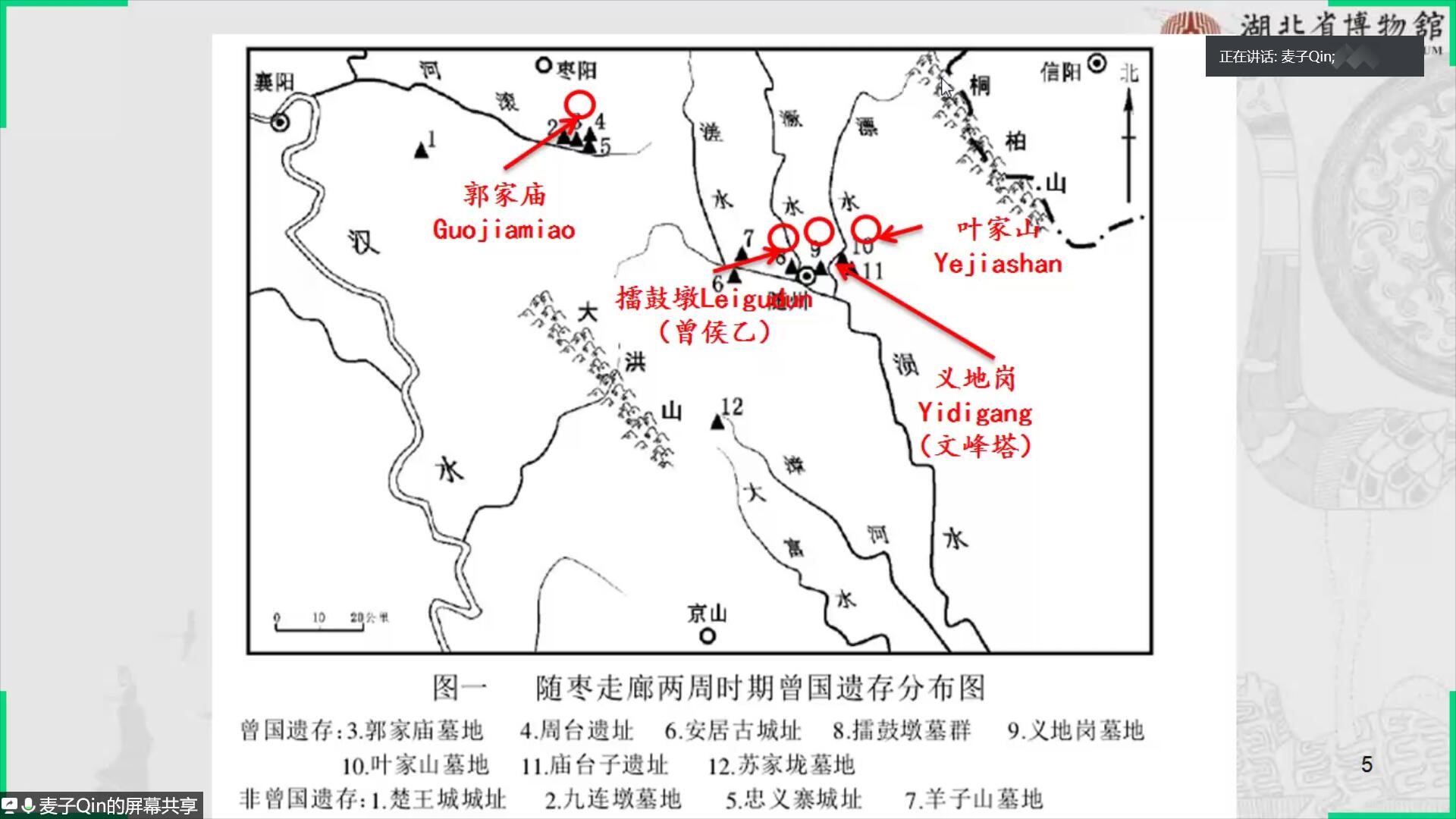 第三部分是“曾国的疆域”。 方勤研究员主要介绍了从西周到战国时期曾国的疆域发展。西周早期,曾国活动疆域主要在随州叶家山墓地及疑似其早期都邑的庙台子遗址群一带,局限于今随州漂水以东的区域。西周晚期至春秋早中期,因昭王、穆王南征伐楚,曾国逐渐向汉水流域迁移,成为周王朝抵御楚国越汉东进的前沿屏障,占有西起南阳盆地南部,东到随枣走廊,包括走廊东南端的漳河谷地,一带的广袤区域,成就了“汉东之国随为大”。到春秋晚期至战国中期,曾国的政治中心和活动疆域都主要在今随州一带。