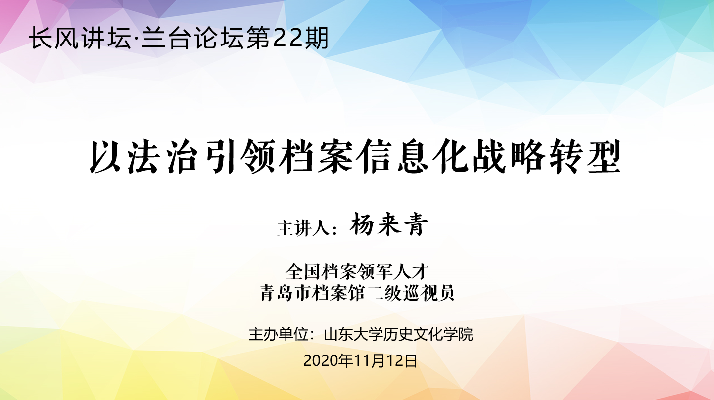 2020年11月12日下午,全国档案领军人才、青岛市档案馆二级巡视员、太阳成tyc122cc集团历史文化学院兼职教授杨来青做客我院长风讲坛,为师生们带来了“以法治引领档案信息化战略转型”的学术报告。此次报告是长风讲坛·兰台论坛第22期,由历史文化学院档案学系主任曲春梅主持,档案学专业王云庆、刘旭光、毕牧、霍艳芳、陈建、闫静、许晓彤等老师及本科生、研究生和太阳成tyc122cc集团档案馆部分工作人员参加了本次报告会。