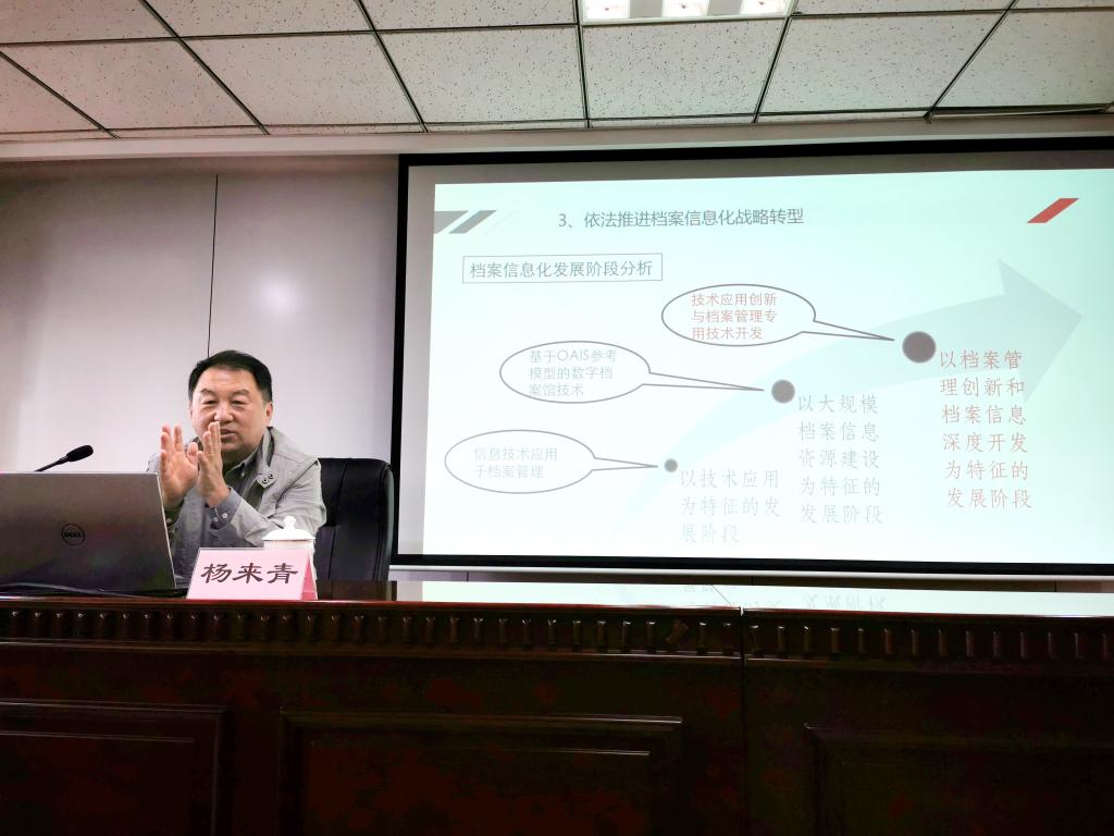 随后,杨教授分享了他对于《档案法》的学习体会。他指出新《档案法》对不同主体提出了新的要求:对于政府而言,要将档案信息化纳入信息化发展规划,保障数字档案资源的安全保存和有效利用;对于档案行政主管部门而言,积极主管、监督和指导档案工作,检查档案信息化建议和信息安全保障情况等。