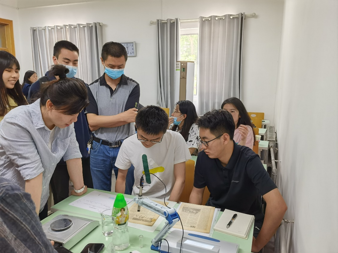 讲述完成后进入本次讲座的体验实验环节,侯老师和助理指导大家完成一个简单的纸张酸化情况测量实验。该实验使用台式pH测量仪、纸张厚度测量仪、直尺、电子天秤、色差仪对一组A4打印纸、未脱酸和脱酸后的旧机制纸进行测量和数据记录。通过实验,同学们体会到了科学方法在档案保护中的作用,例如凭借肉眼完全无法区分的未脱酸和脱酸后的旧机制纸,使用pH测量仪可以测量到酸性和弱碱性的数值差异。
