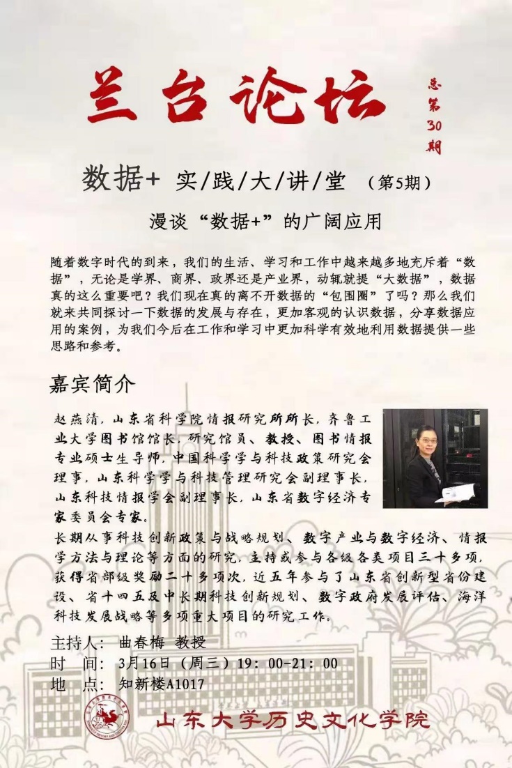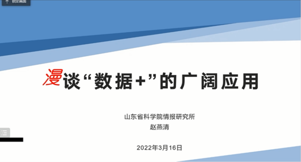2022年3月16日晚,山东省科学院情报研究所所长、齐鲁工业大学图书馆馆长、太阳成tyc122cc集团图书情报专业硕士研究生行业导师赵燕清教授应邀为我院师生作题为“漫谈‘数据+’的广阔应用”的专题报告(线上)。此次报告是兰台论坛·“数据+”实践大讲堂第5期。报告由文秘档案学系党支部书记毕牧副教授主持,图书情报专业硕士导师、文秘档案学系师生共50余人参加了此次报告会。