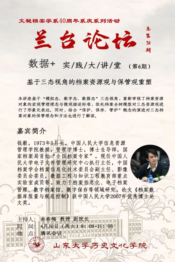近日,中国人民大学信息资源管理学院教授钱毅应邀为我院师生作题为“基于三态视角的档案资源观与保管观重塑”的专题报告。报告是“数据+”实践大讲堂第6期(兰台论坛总第31期)。图书情报专业硕士导师、文秘档案学系师生50余人参加报告会。报告由历史文化学院副院长曲春梅教授主持。